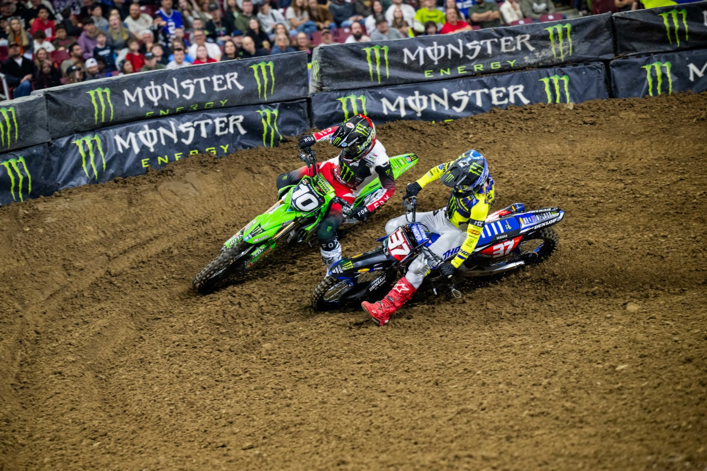 450SXのメインレース(20分+1周)は、ハンター・ローレンス(ホンダ)のホールショットで始まった。オープニングから激しい競り合いとなり、ホルヘ・プラード(KTM)が前に出るとローレンスが抜き返す。2周目にはロクスンがトップに立ち、徐々にリードを広げた。プラード、ローレンスにジャスティン・クーパー(ヤマハ)が加わり、2~4位争うグループを形成した。