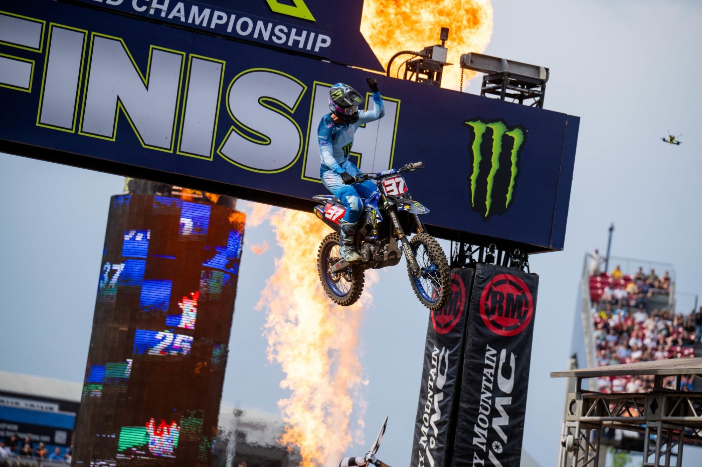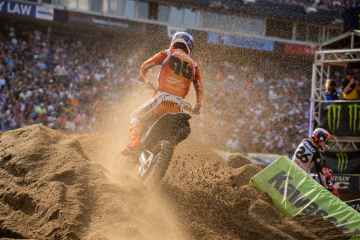 ハーフウェイポイントを折り返す頃、ローレンスがスパートを開始。テールトゥノーズに発展したバトルは、14周目に決着が付く。ローレンスが前に出た次の周、ロクスンが転倒を喫して4位に後退。この時点で15秒のマージンを得たローレンスが、独走状態を保って今シーズン4勝目を挙げた。2位にはスタート11位から挽回してきた、クーパー・ウェブ(ヤマハ)が食い込み、ロクスンも3位まで巻き返しチェッカーを受けた。