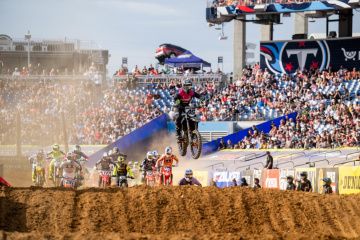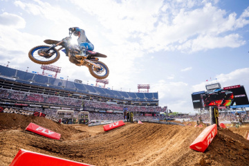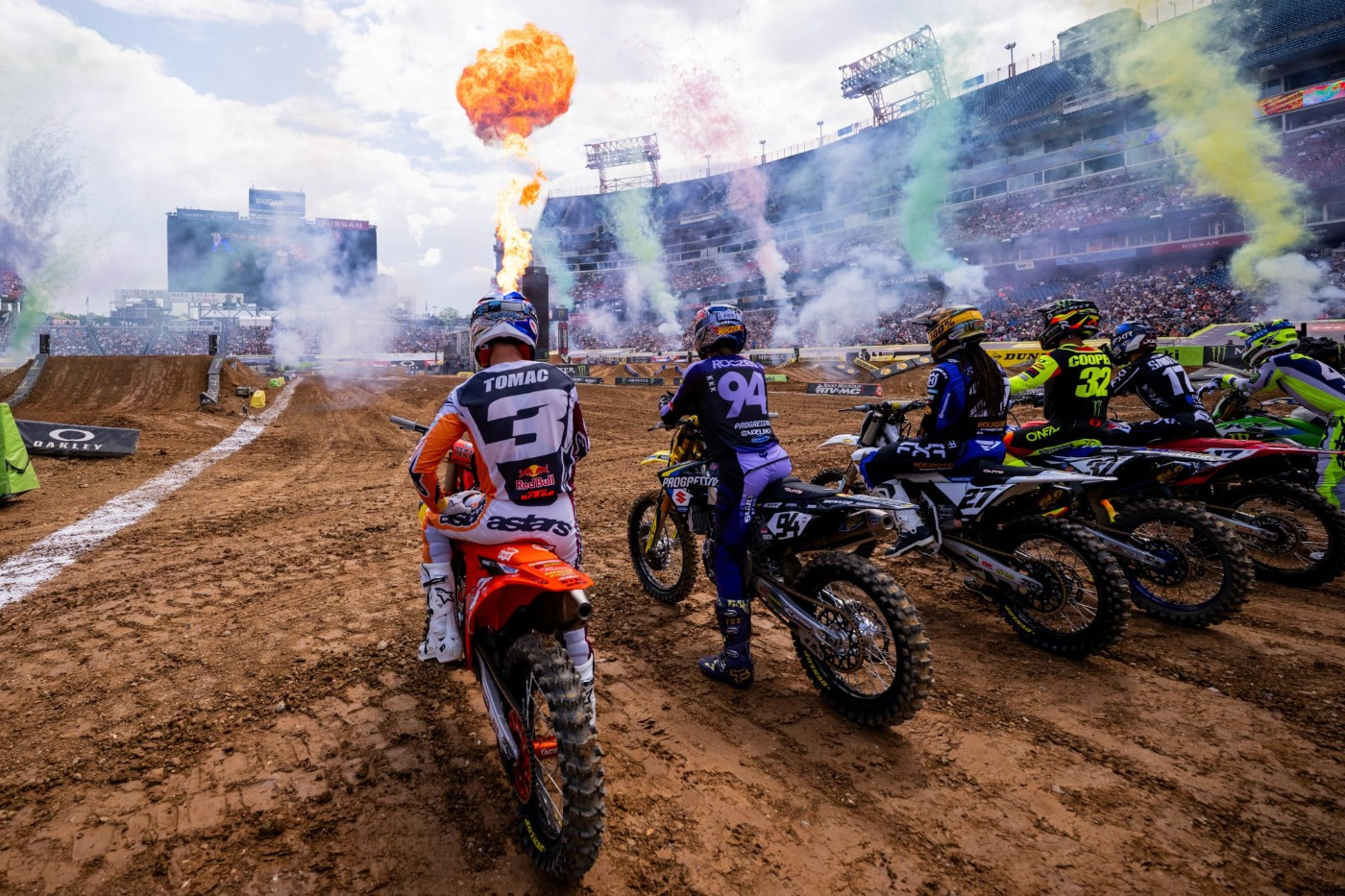 ナッシュビルのダウンタウンを流れるカンバーランド川の対岸に、今は新旧ニッサン・スタジアムが並び立っている。片や現在工事中のインドア競技場だが、完成予定の2027年夏までは既存の屋外スタジアムがスーパークロス会場となる。今年はテレビ放送枠の事情もあって、タイムスケジュールが5時間ほど前倒しされた。13時30分にオープニングセレモニー、17時にメインレースが終了するデイレースなので、直射日光を受けた路面がハードパックになりやすい。それでも今回は、MX14タイプのマディ/サンド用タイヤを選ぶライダーが現れ、スタートライン付近で注目の的となっていた。