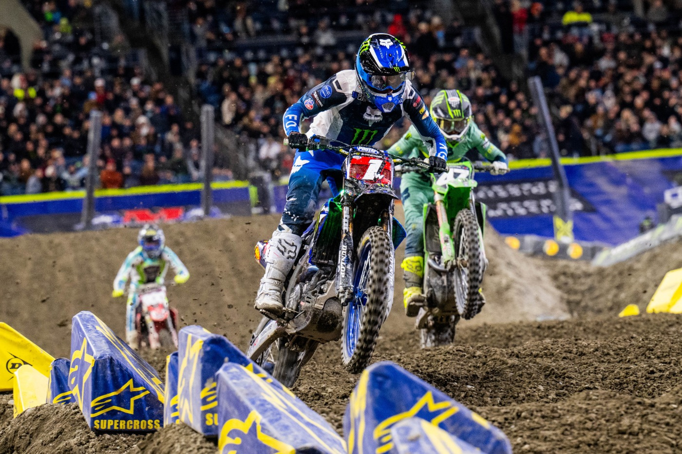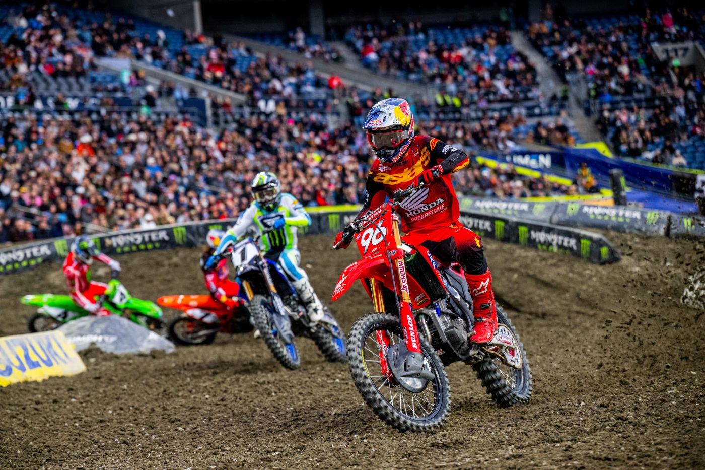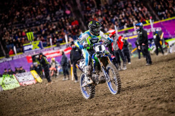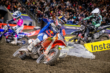 450SXのメインレース(20分+1周)は、クーパー・ウェブ(ヤマハ)のホールショットで始まった。2周目にイーライ・トマック(KTM)が2位、3周目にケン・ロクスン(スズキ)3位に上がると、上位グループの顔ぶれが固まった。ウェブは序盤のうちに2~3秒のリードを築いたが、やがてペースが衰えてトマックが接近。シアトルを得意とする二人(2018・2022・2023=トマック優勝/2024・2025=ウェブ優勝)の一騎打ちが始まった。