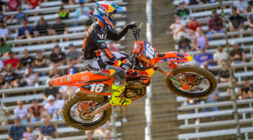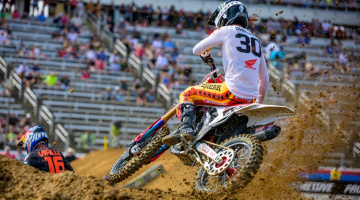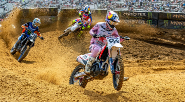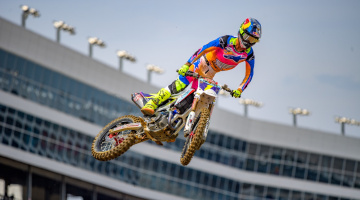 450SMXのヒート2では、ディラン・フェランディス(ホンダ)とアーロン・プレシンガー(KTM)がホールショットを争った。ヒート1のトップスリーは揃ってスタートに失敗し、1コーナー立ち上がりの計測地点では、H・ローレンス12位、トマック13位、J・ローレンス16位と出遅れた。2周目からはチェイス・セクストン(KTM)がレースを支配する。ハーフウェイを折り返す頃までに、セクストンが10秒以上の独走態勢を築くと、総合結果に影響する2~4位の行方に視線が注がれるようになった。10周目には、挽回してきたローレンス兄弟が2~3位。ウェブを挟んでトマックが5位まで到達したが、それ以上のポジション変動はないままチェッカーとなった。
