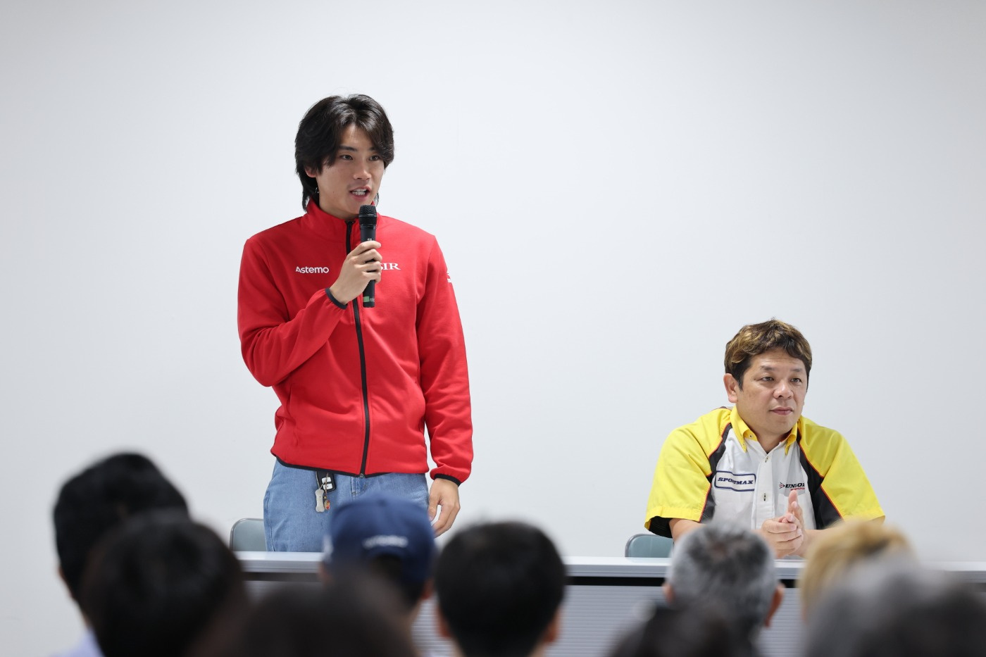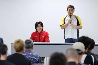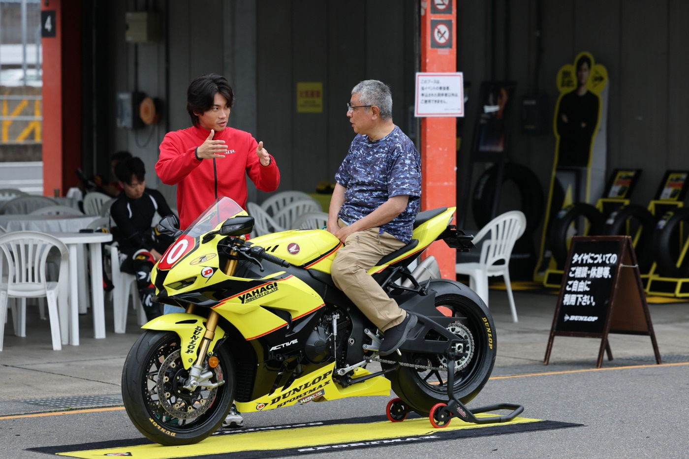 お昼は、お弁当を配布させて頂き、その後、12時45分からゲストによりますライディングレクチャーを、今回インストラクターで来て頂いた、全日本選手権ST1000クラストップライダーの荒川晃大選手と2人で、皆様に実車を基にアドバイスさせて頂きました。