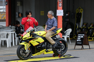 進行は、受付の後、車検、走行前ミーティング、そして今回のゲスト、元メーカーファクトリ―ライダーで、現在ホンダレーシングスクールの講師や、ここもてぎにおいて、レーシングアドバイザーを担っておられる亀谷長純氏によるストレッチを進めさせて頂きました。