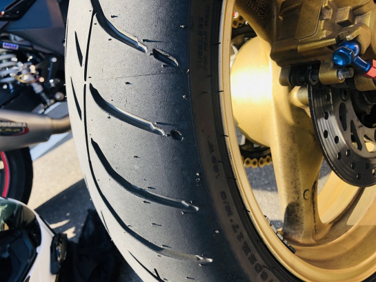 ちょっとしたスポーツ走行も可能で走りこめばしっかりと熱も入ります。サイドはグリップ志向のコンパウンドを使用し、ツーリングペースであれば十分すぎるグリップでしょう。
