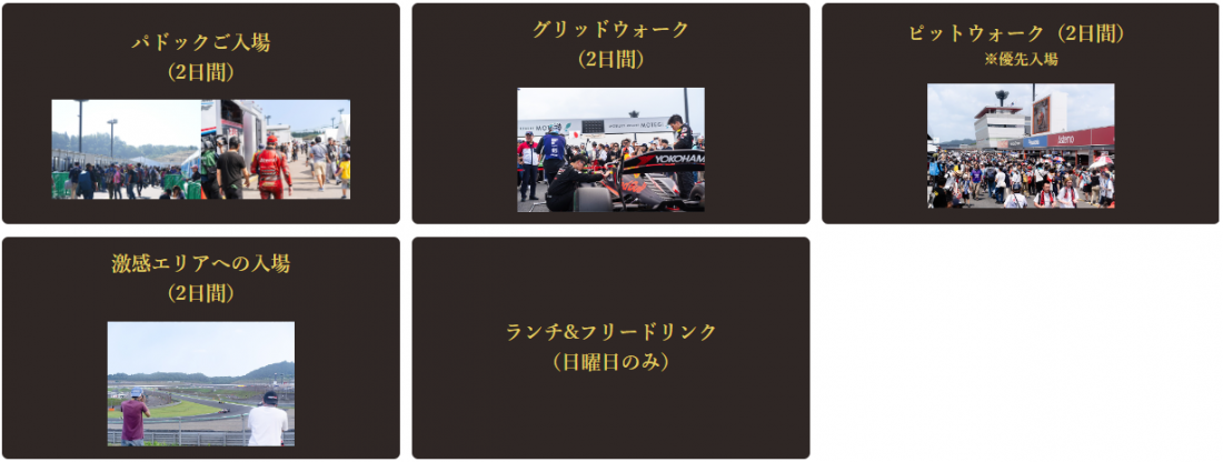 DUNLOPホスピタリティチケット購入者には、VIPスイートでランチとフリードリンクをご提供します(日曜日のみ)。また、特典としてパドックパス、グリッドウォークパス、ピットウォークパス、激感エリアパスがご利用可能。