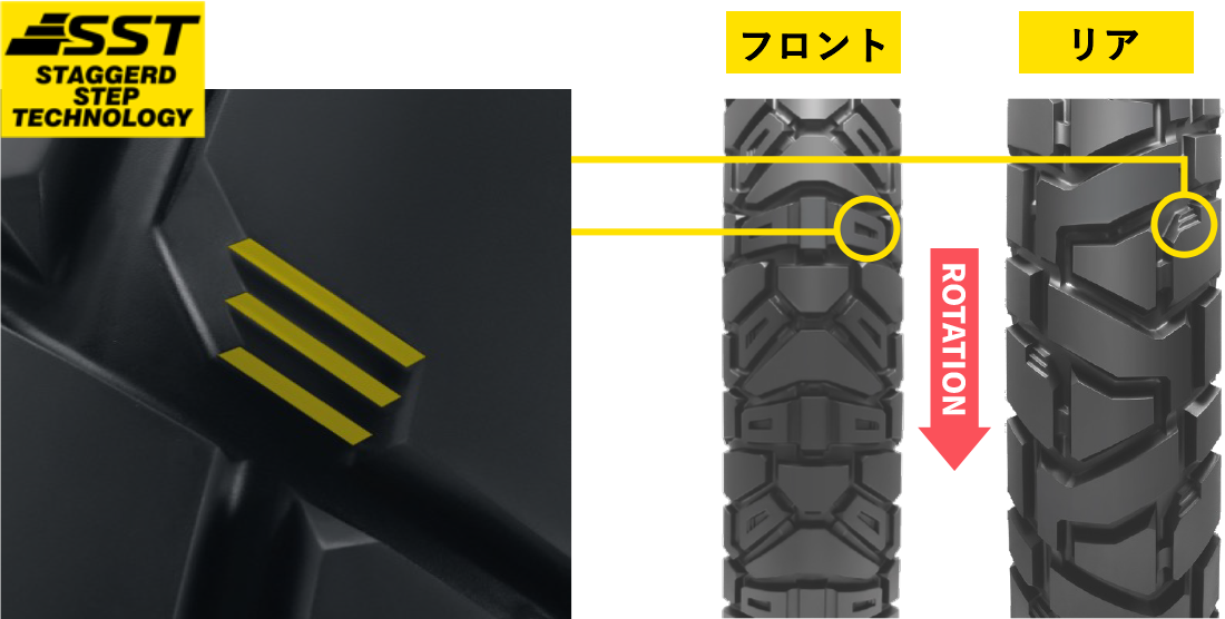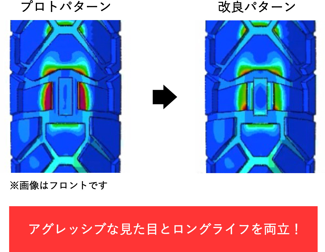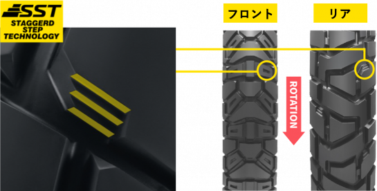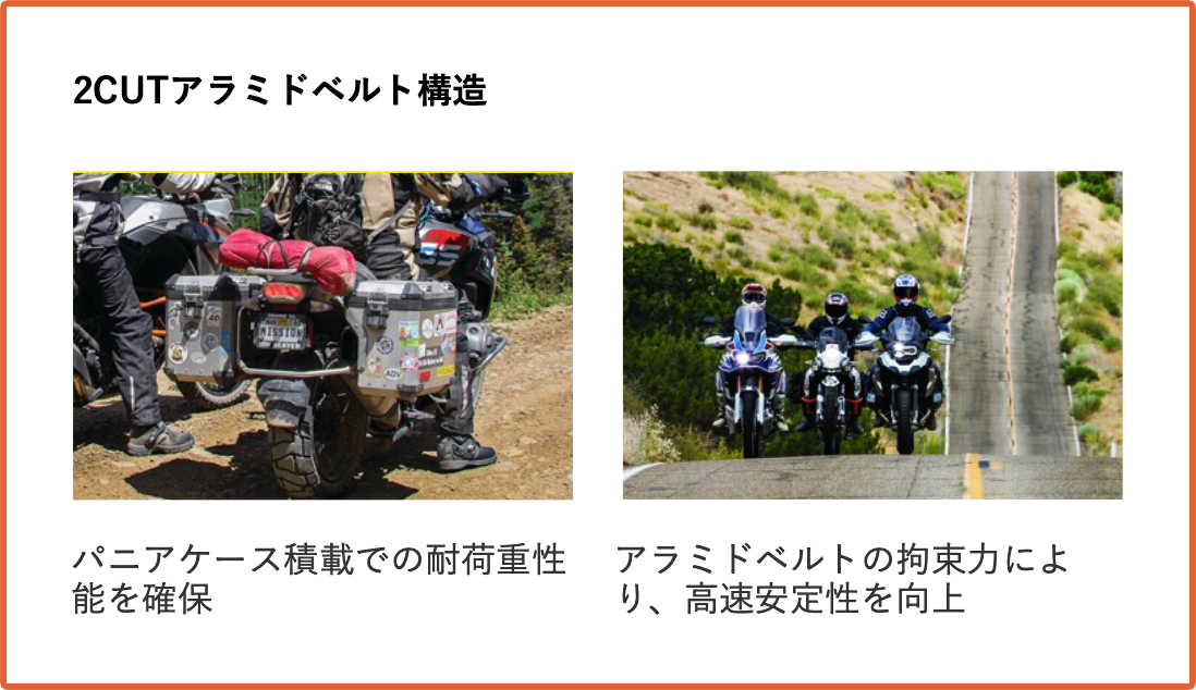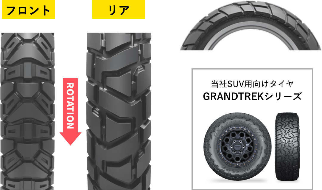ロングツーリングにも耐えうるライフ性能と、オフロードでのトラクション性能を強化。