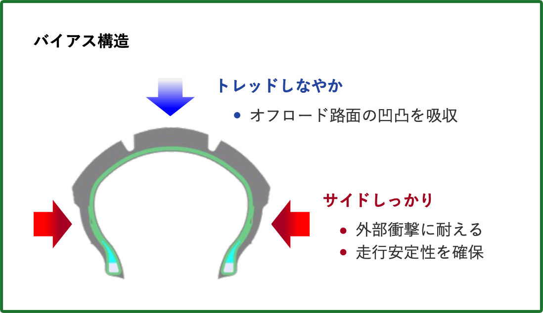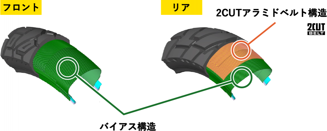 オンロード路面での安定性を両立する為に、ベルテッドバイアス構造を採用