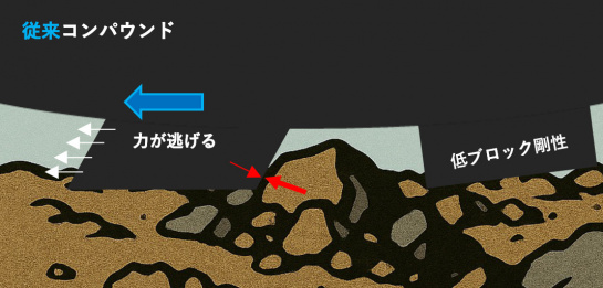 段差配置により、摩耗進行後もエッジを維持しトラクション性能を持続。