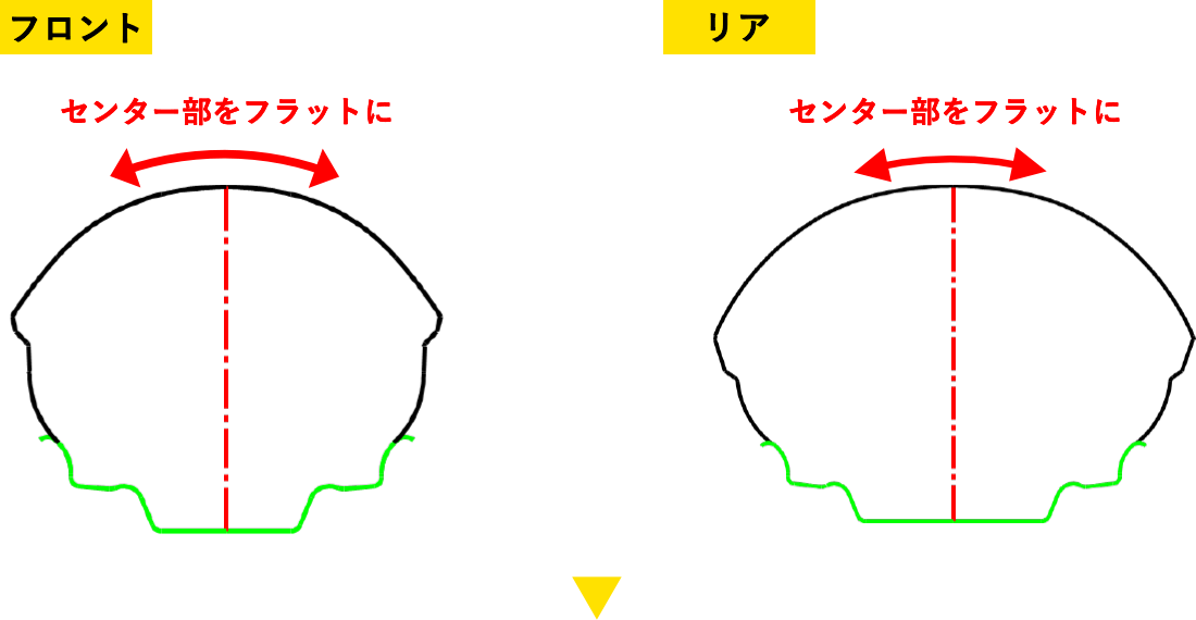 フラットプロファイルの採用により、ライフと直進安定性を向上