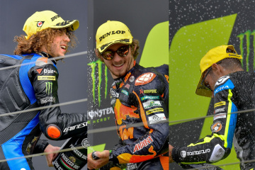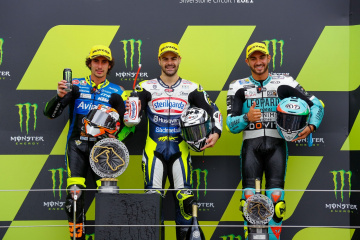 G・ロドリゴ選手(HONDA)が2位、R・ロッシ(KTM)が3番手。首位のP・アコスタ選手(KTM)は、22位となる。