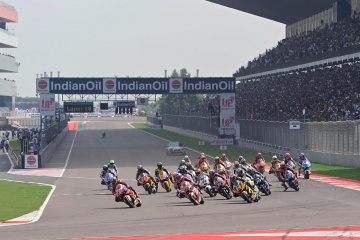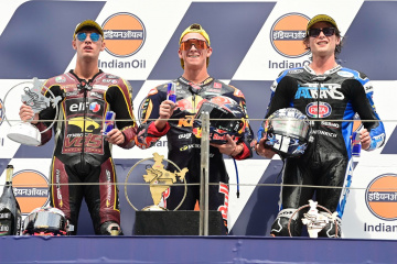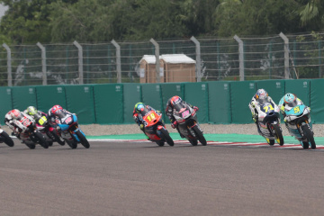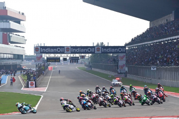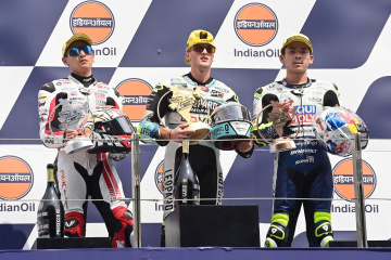 第13戦は、初開催となるインド・ラウンド。金曜日から猛暑やスコールに見舞われながら、走行を続けていった。ハーフ・ウェット・コンディションで行われた予選では、J・ディクソン選手(KALEX)がポール・ポジションを獲得。「午前中に転倒があったりして、難しかったけど、チームのおかげでポールを取れた。明日のレースには自信があるよ」とディクソン選手。首位のP・アコスタ選手(KALEX)が2位、S・ガルシア(KALEX)が3位に続く。小椋藍選手(KALEX)は、15位5列目となる。「ハーフ・ウェットとなり、フィーリングが難しかった。明日はできるかぎり追い上げたい」と小椋選手。