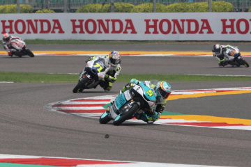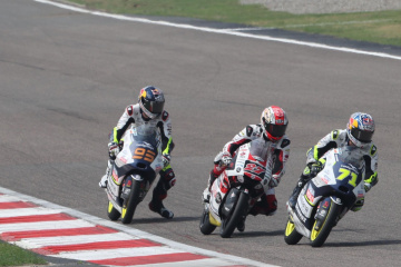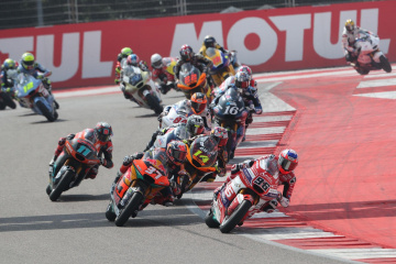 決勝が始まると、ディクソン選手がホール・ショット。アコスタ選手、T・アルボリーノ選手(KALEX)、ガルシア選手などが続く。ところが、スタート直後に多重クラッシュが起き、赤旗が出される。12周に減周となり、やり直しとなる。2度目のスタートが切られると、ガルシア選手が好ダッシュ。後ろからアコスタ選手、ディクソン選手、アルボリーノ選手などが続く。