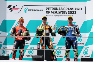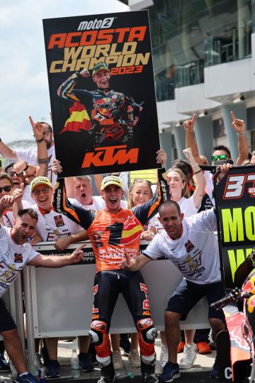 「Moto3クラスに続いて、2つめのタイトルを獲得できたなんで、信じられない気持ちです。チームに感謝したいです。僕は背が低くて体重が軽いから、去年の最初はセッティングが大変でよく転倒した。今年、うまく走れるようになったのはチームのおかげです。最後のバレンシア戦が終わるまで、今日はまだ泣かないでおきます」